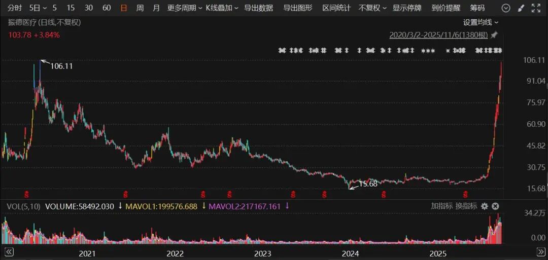 11月6日开盘后,振德医疗一度涨至104.84元的高点,截至发稿,涨超3%。