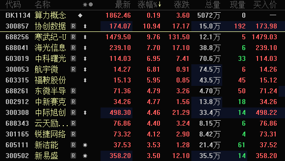 除寒武纪-U外,海光信息、中芯国际、通富微电、芯原股份、龙芯中科等AI芯片概念股也有不同程度上涨。