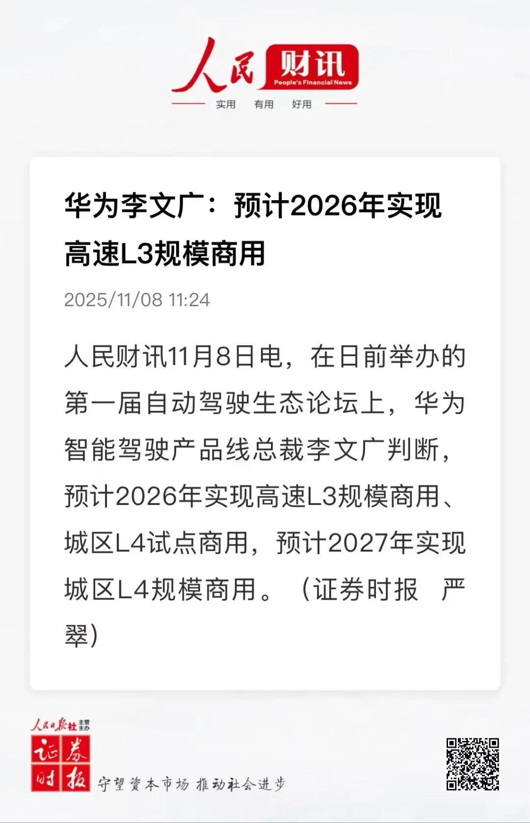在日前举办的第一届自动驾驶生态论坛上,华为智能驾驶产品线总裁李文广判断,预计2026年实现高速L3规模商用、城区L4试点商用,预计2027年实现城区L4规模商用。