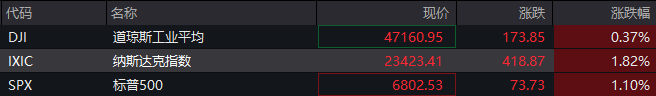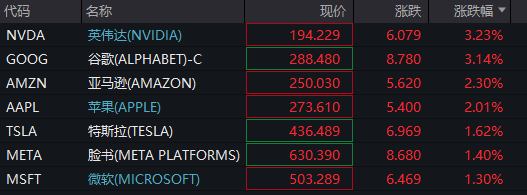 具体个股方面,科技七巨头全线上涨,英伟达、谷歌涨超3%。花旗对英伟达持30天短期看涨观点,将目标价从210美元上调至220美元。