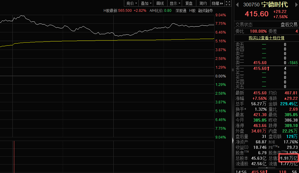 11月13日,宁德时代A股股价大涨超7%,收盘价达到415.6元,创出历史新高。从A股市值角度来看,宁德时代A股市值已突破1.8万亿元,位居A股第五,进一步拉近与贵州茅台的距离。