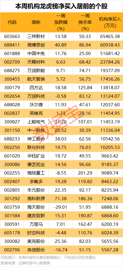 龙虎榜数据显示,本周机构专用席位共现身142股龙虎榜,净买入69只,净卖出73只。其中,52股获机构净买入超1000万元,三祥新材、海博思创等14股获机构净买入金额均超1亿元。