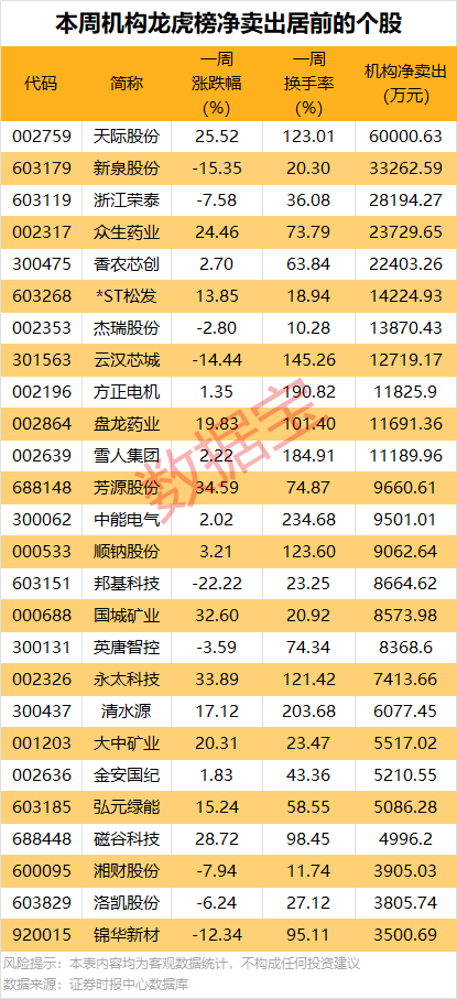 机构净卖出的个股中,净卖出金额最多的是天际股份,该股本周累计上涨25.52%,周换手率为123.01%,本周两次上榜龙虎榜,买卖居前席位中,机构合计净卖出6亿元,资金流向方面,该股本周资金净流出8.81亿元。