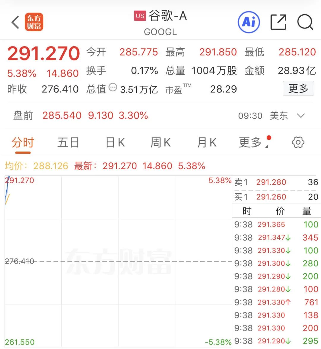 热门个股方面,谷歌A开盘大涨,截至发稿,该股上涨5.38%。