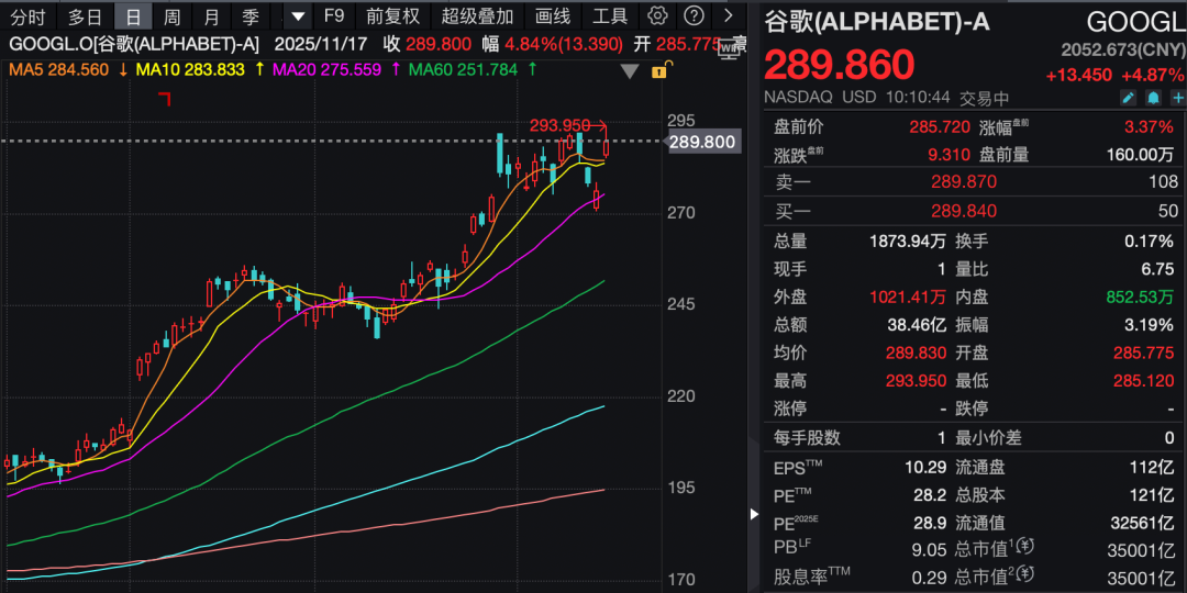 谷歌盘中一度涨近5%。消息面上,伯克希尔·哈撒韦公布了第三季度的13F报告。这份报告也是巴菲特在结束长达60年的首席执行官任期之前,最后一次详细披露其股票投资组合。报告显示,巴菲特第三季度抛售大量苹果股票,同时买入谷歌母公司Alphabet股份。
