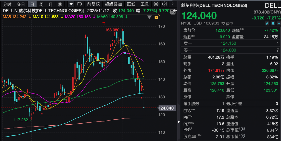 科技股多数下跌,戴尔科技跌超7%,英伟达、苹果跌逾1%。
