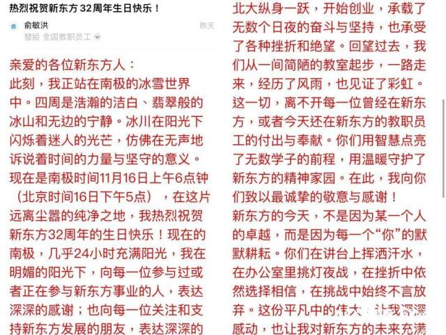 俞敏洪在南极发布内部信祝贺新东方成立32周年,却遭遇争议。这封署名为“俞敏洪在南极”的内部信,共5次出现“南极”二字,多位网友于社交平台吐槽称,“满篇看下来,整个脑子都是南极”“全员信更像是俞敏洪的自我感动”等等。