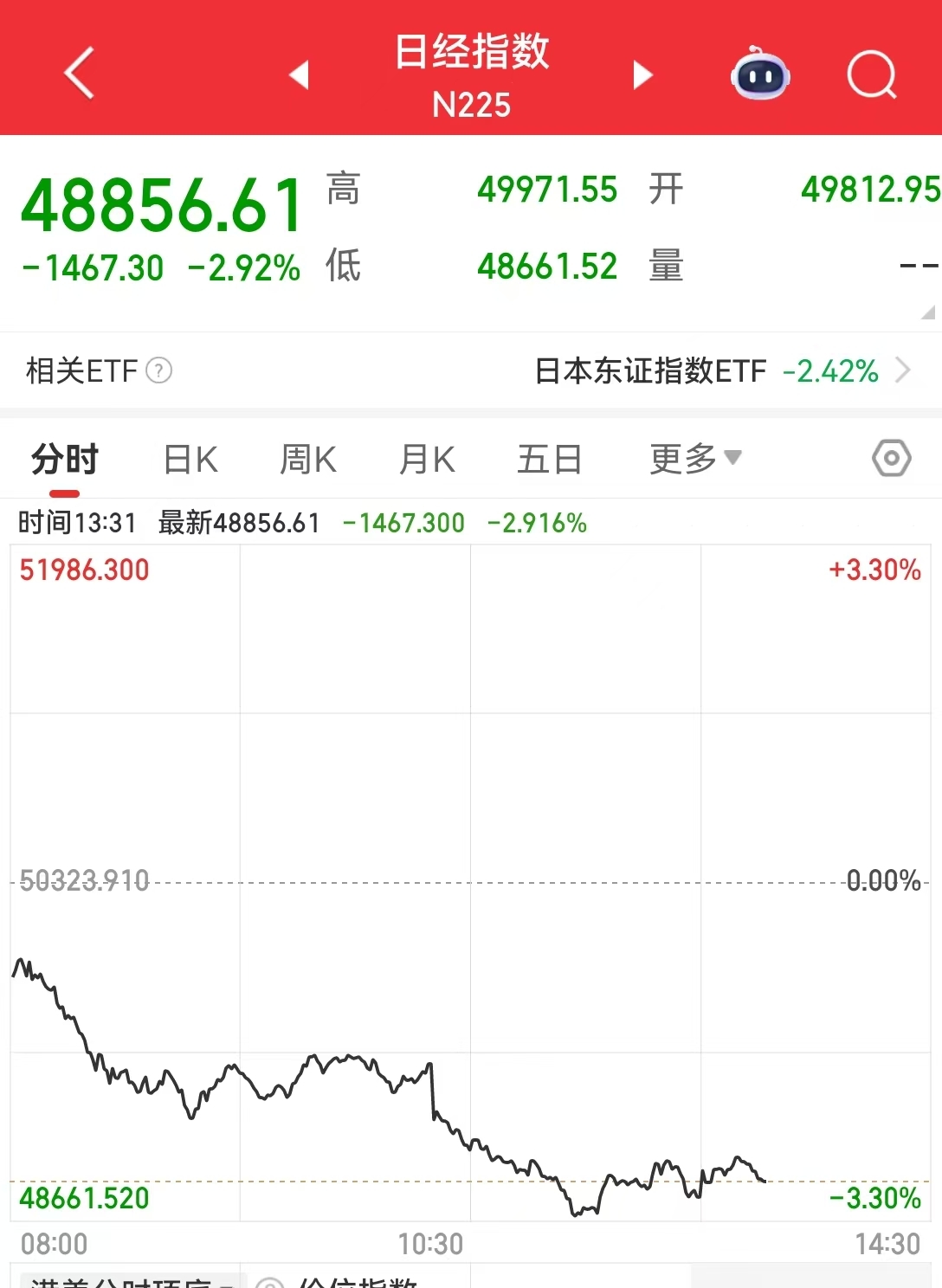 截至发稿,日经225指数报48856.61点,跌幅2.92%。
