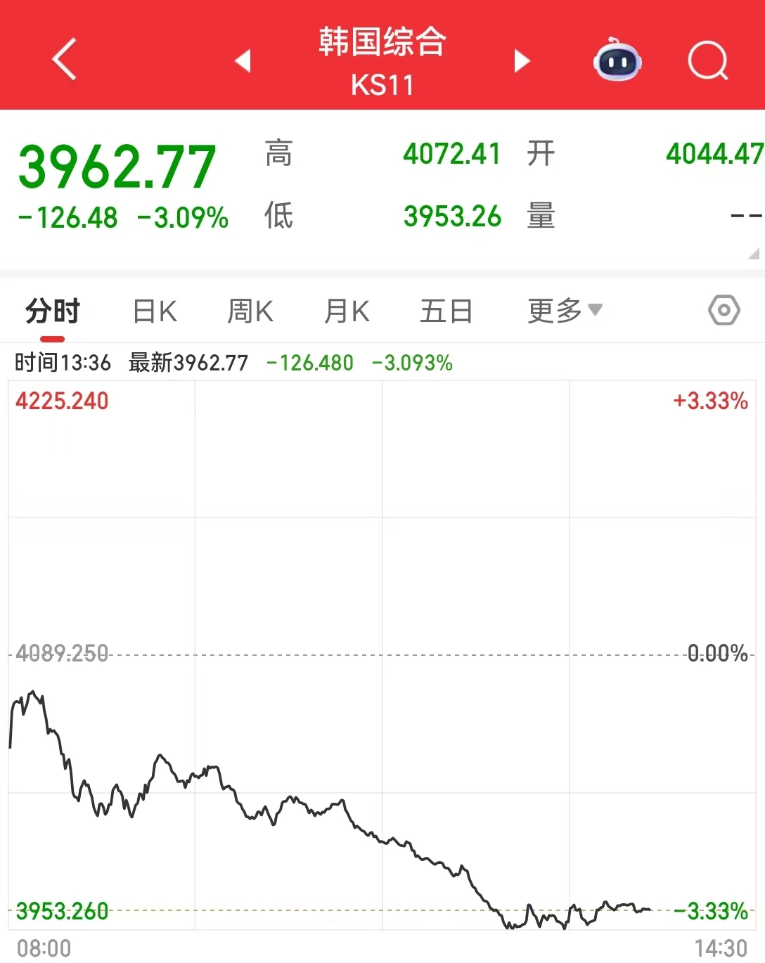 韩国股市11月18日也显著下挫。截至发稿,韩国综合指数跌超3%。
