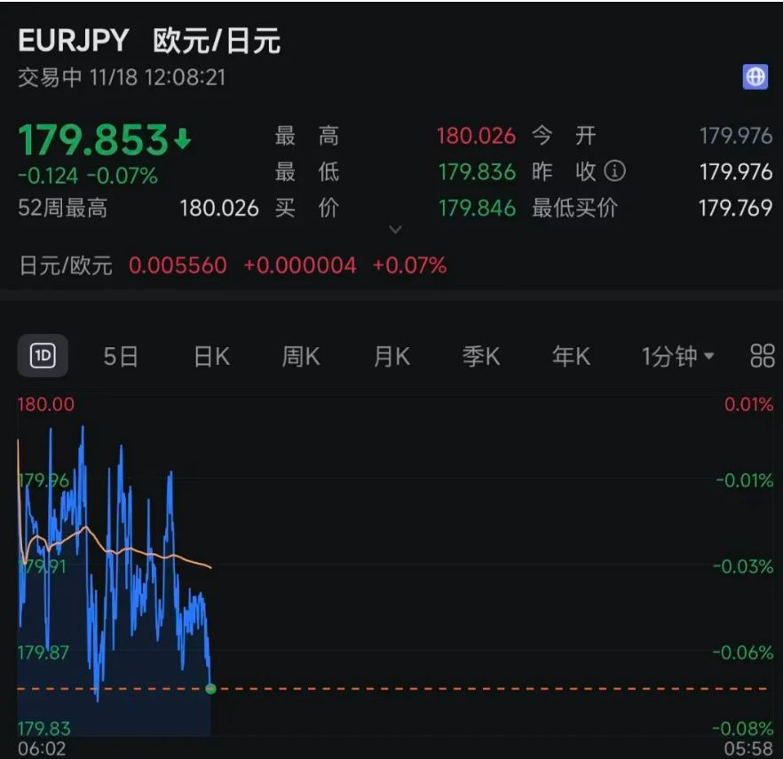 日元也延续弱势。欧元对日元汇率盘中再次升破180关口。日本共同社此前报道称,这是自1999年以来日元首次跌落180区间,投资者对日本财政状况恶化的担忧导致日元被抛售。