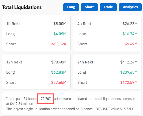 由于剧烈震荡,据CoinGlass数据显示,近24小时内,加密货币共有超17万人爆仓。