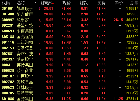 零售股尾盘集体飙升,截至收盘,凯淳股份、华人健康20%涨停,欢乐家涨超15%,东百集团、国光连锁、三江购物等均涨停。