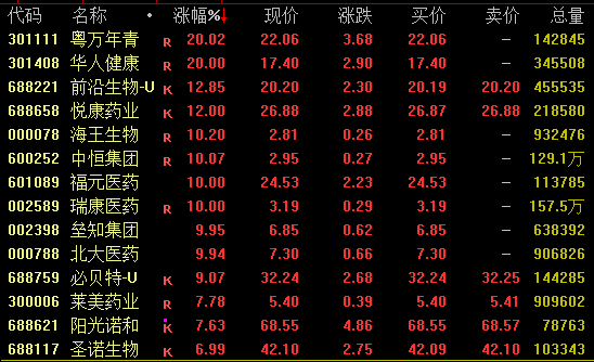 医药板块盘中强势拉升,创新药、疫苗概念表现亮眼。截至收盘,粤万年青、华人健康20%涨停,前沿生物、悦康药业涨超10%,海王生物、福元医药等均涨停。
