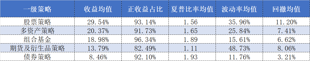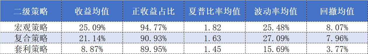 其中,宏观策略私募产品在收益均值、正收益占比以及夏普比率均值三个维度上的表现更胜一筹。