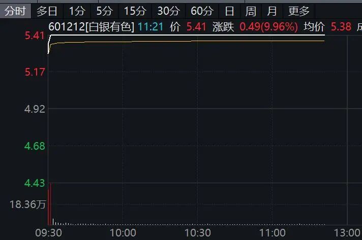 早间,有色金属概念股全线走强,工业金属板块指数盘中一度放量大涨逾5%,开盘不到1小时成交超前一交易日全天成交。白银有色仅约1分钟就直线涨停,罗平锌电也仅约2分钟垂直封板,闽发铝业、亚太科技等均快速涨停。