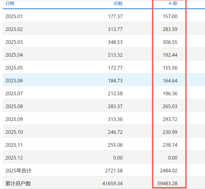 综合来看,2025年前11个月已累计新开2484.02万户,同比增长7.95%,值得一提的是,2024年全年开户数合计为2499.89万户,这意味着,今年前11个月开户数几乎追平去年全年,仅相差15.87万户。