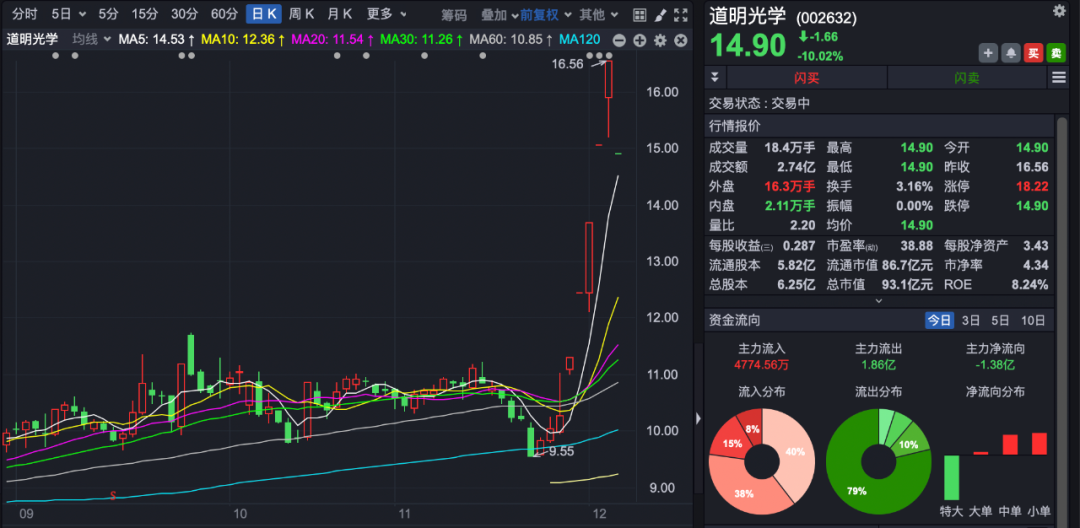 近期获得市场高度关注的AI手机板块,12月4日震荡回调,道明光学跌停,东田微、奥尼电子、美芯晟、弘信电子等跟跌。