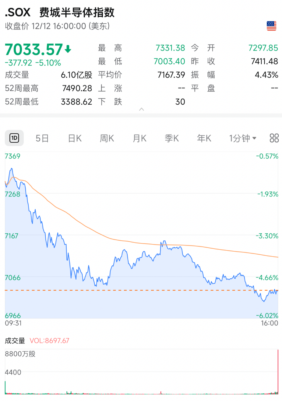 美东时间12月12日,美股科技股全线重挫,三大指数集体收跌,道指跌0.51%,纳指大跌1.69%,标普500指数大跌1.07%。