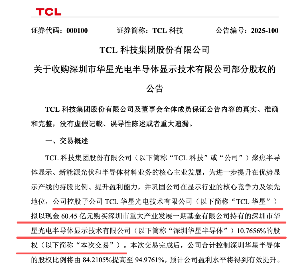 12月15日,TCL科技(000100)发布公告,控股子公司TCL华星光电技术有限公司(简称“TCL华星”)拟以现金60.45亿元购买深圳市重大产业发展一期基金有限公司持有的深圳市华星光电半导体显示技术有限公司(简称“深圳华星半导体”)10.7656%的股权。交易完成后,公司合计控制深圳华星半导体的股权比例将由84.2105%提高至94.9761%,预计公司盈利水平将得到有效提升。