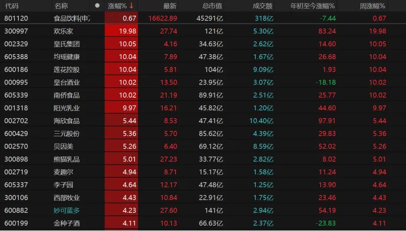 7只食品饮料个股涨停,欢乐家“20cm”涨停,皇氏集团、均瑶健康、莲花控股、皇台酒业、南侨食品、阳光乳业涨停。