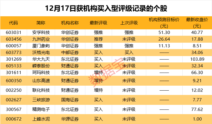 据证券时报•数据宝统计,今日机构研报共发布12条买入型评级记录。其中,安孚科技、九洲药业、厦门象屿机构发布的预测目标价为51.3元/股、26.64元/股、11.13元/股,距离最新收盘价的上涨空间分别为25.83%、 48.99%、30.79%。