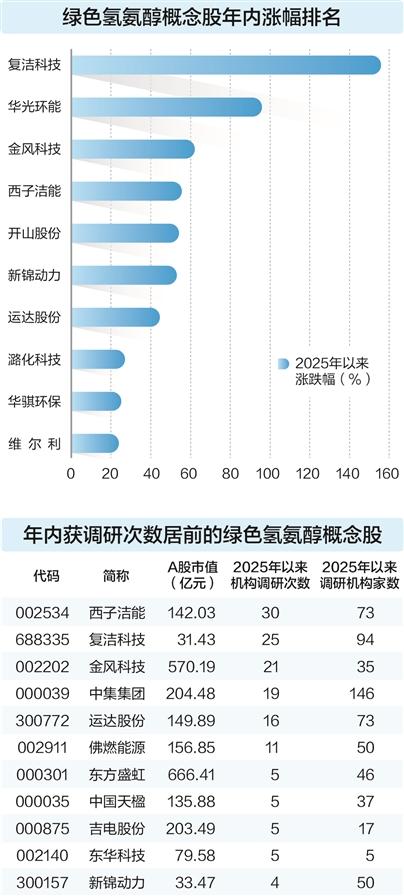 机构关注度方面,数据宝统计,今年以来机构调研10次以上的绿色氢氨醇概念股有6只,分别为西子洁能、复洁科技、金风科技、中集集团、运达股份、佛燃能源。