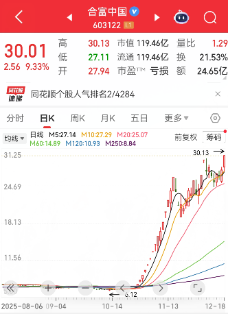 人民财讯12月18日电,12月18日,合富中国(603122)收盘上涨9.33%,最新收盘价报收30.01元/股,创下历史新高,年内累计涨幅达到336.18%,最新A股市值逼近120亿元。公司12月10日发布的营业收入简报显示,2025年1-11月营业收入为6.28亿元,同比下滑26.02%。