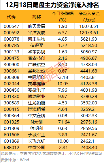 个股方面,航天发展、平潭发展2股尾盘主力资金净流入超1亿元;海王生物、值得买、华策影视、香农芯创等个股尾盘主力资金净流入金额均超4000万元。