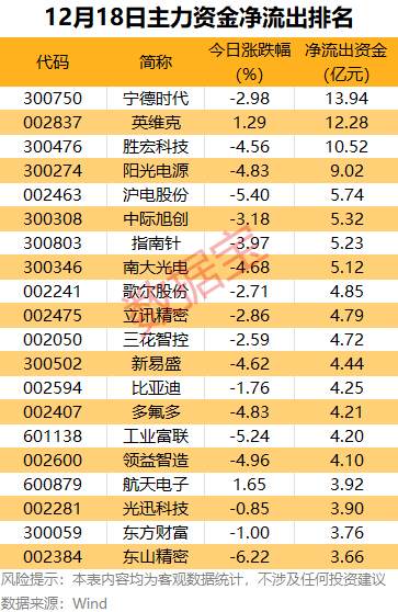 今日有45股主力资金净流出超2亿元,其中,宁德时代、英维克、胜宏科技净流出金额均超10亿元。