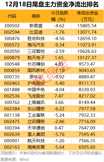 尾盘主力资金净流出方面,新易盛、比亚迪、胜宏科技、海马汽车、三花智控、航天电子尾盘主力资金净流出超1亿元。