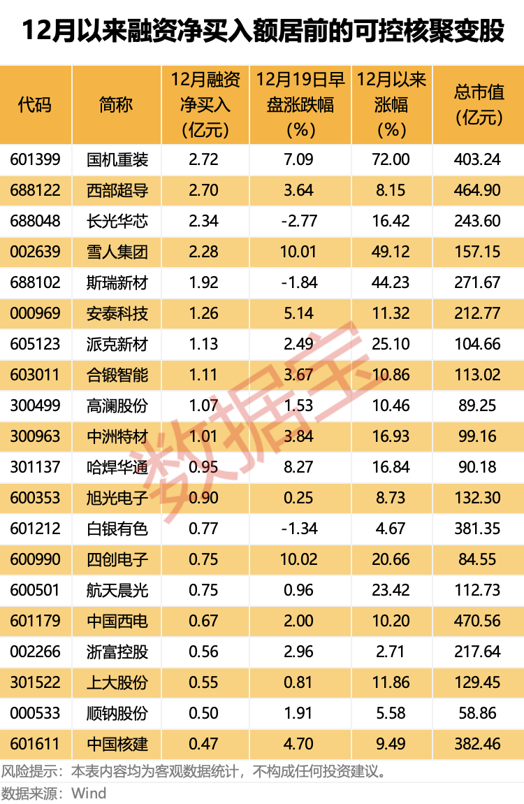 据证券时报·数据宝统计,A股中布局可控核聚变产业链的概念股共有59只。从资金流向上来看,12月以来,杠杆资金显著加仓可控核聚变板块,融资净买入合计金额达到10.52亿元。10股融资净买入超1亿元,国机重装、西部超导、长光华芯融资净买入金额居前,分别达到2.72亿元、2.7亿元、2.34亿元。
