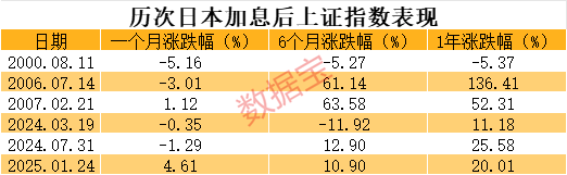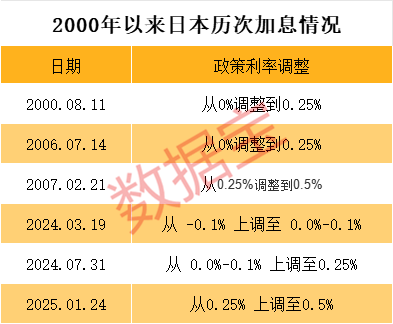 据证券时报·数据宝统计,进入2000年以来,日本已加息六次,分别是: