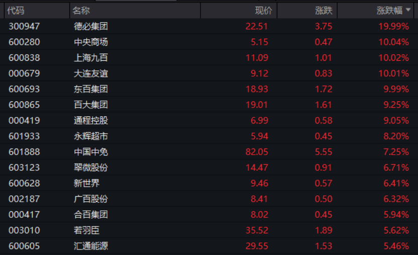 从行业板块和赛道来看,若按照申万一级行业划分,商贸零售板块大涨,板块盘中涨幅一度接近4%,板块内个股掀起涨停潮。德必集团“20cm”涨停,中央商场、上海九百、大连友谊、东百集团等股票涨停,百大集团涨9.25%,永辉超市涨8.20%。