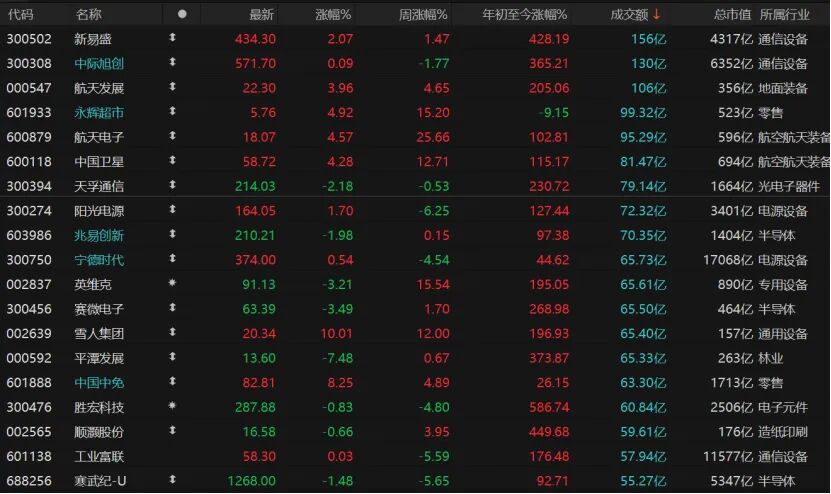 赚钱效应不错,4477只个股收涨,涨停股82只;905只个股收跌,跌停股6只。日成交额超过100亿元的个股仅有三只,新易盛收涨2.07%报434.3元/股,中际旭创微红,航天发展收涨3.96%报22.3元/股,永辉超市涨近5%。