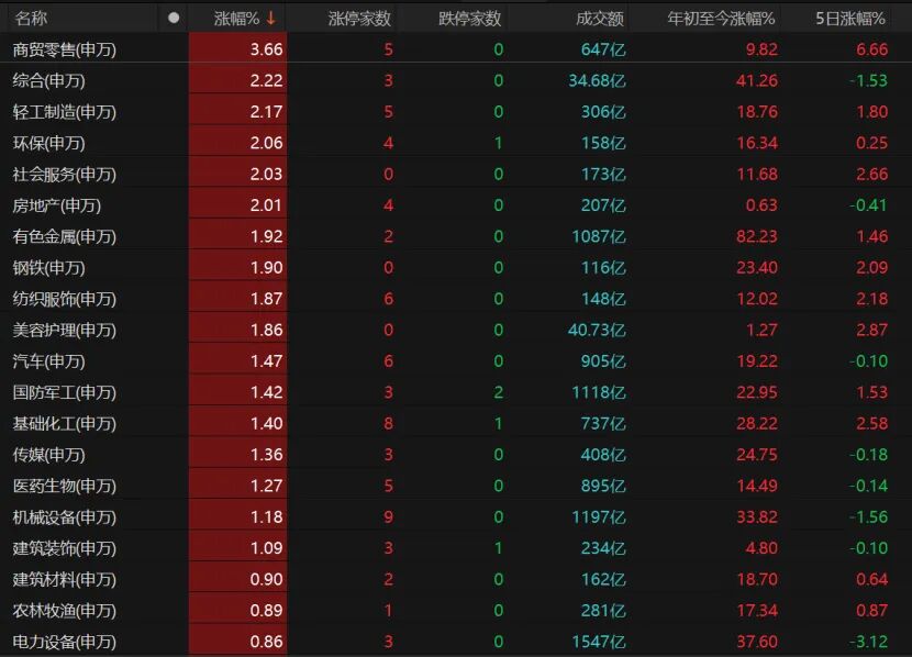 板块普涨,31个申万一级行业中共计28个收红,除了银行、电子、煤炭微跌,其余均收涨。商贸零售、综合、轻工制造、环保、社会服务、房地产板块涨幅均超过2%,有色金属、钢铁、纺织服饰、美容护理、汽车、国防军工、基础化工、传媒、医药生物等板块涨幅不低于1%。