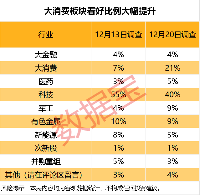 大消费板块看好比例大幅提升