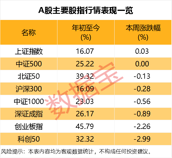 本周(12月15日至19日),A股市场涨跌互现,成交规模维持在1.6万亿元上方。指数方面,上证指数一周小幅上涨0.03%,深证成指下跌0.89%,创业板指下跌2.26%,科创50指数跌幅最高,为2.99%。