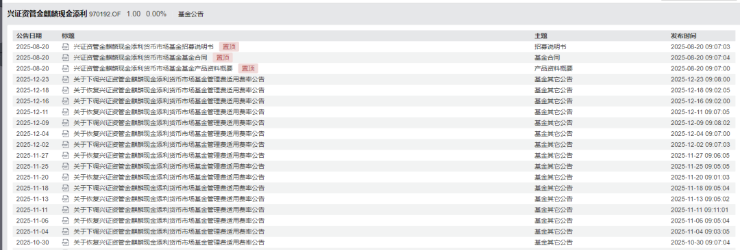 此外,收益率走低不仅直接影响投资体验,还触发多只货币基金的合同降费条款。如12月23日,兴证资管金麒麟现金添利公告称,当以0.7%的管理费计算的七日年化暂估收益率小于或等于2倍活期存款利率,管理费调降至0.3%,以降低每万份基金暂估净收益为负并引发销售机构交收透支的风险。