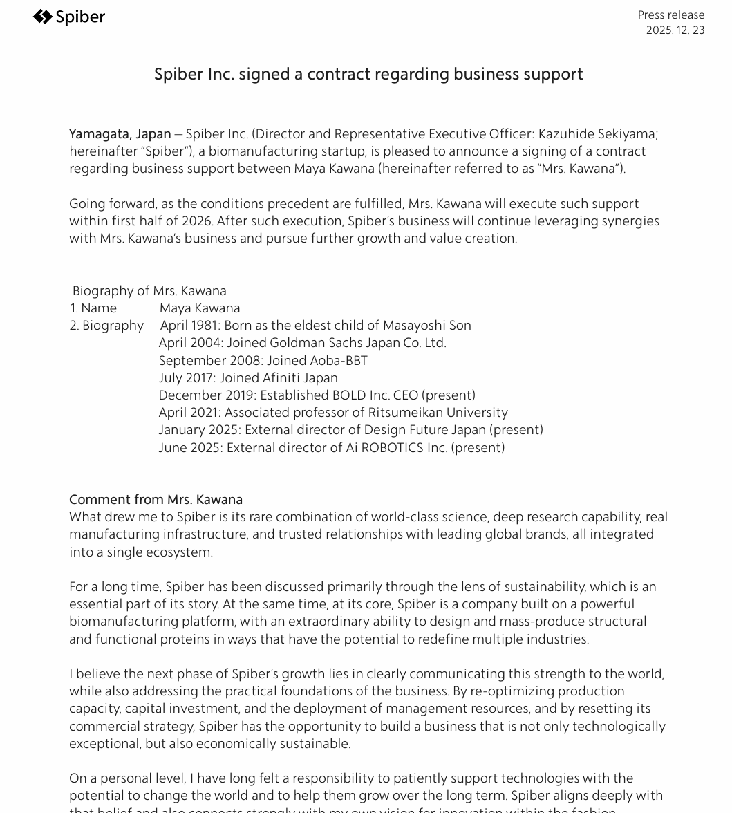 根据Spiber发布的公告,其已与川名麻耶(Maya Kawana)签署业务支持相关协议。待协议生效前提条件满足后,川名麻耶将于2026年上半年开展相关支持工作。相关支持实施后,Spiber将继续借助与川名女士业务的协同效应,追求进一步的发展与价值创造。