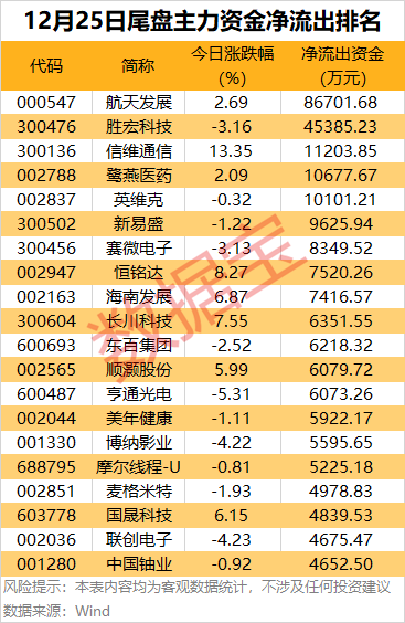 尾盘主力资金净流出方面,航天发展、胜宏科技尾盘净流出金额分别为8.67亿元、4.54亿元。信维通信、鹭燕医药、英维克尾盘净流出均超1亿元。