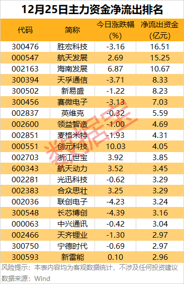 25个主力资金净流出行业中,电子行业主力资金净流出金额居首,超50亿元;有色金属、计算机、医药生物、通信、基础化工等行业主力资金净流出金额均超10亿元。
