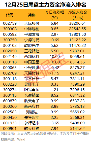 个股方面,天际股份尾盘主力资金净流入3.82亿元,居首;中际旭创、平潭发展、宁德时代、乾照光电尾盘主力资金净流入均超1亿元。