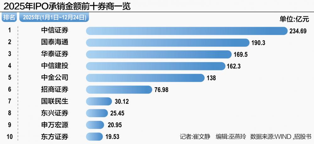 根据Wind数据,以2025年1月1日—12月24日按上市日期统计的A股IPO保荐承销情况来看,国泰海通在承销家数上位列第一,共计服务19家企业上市,比排在第二的中信证券多出3家。