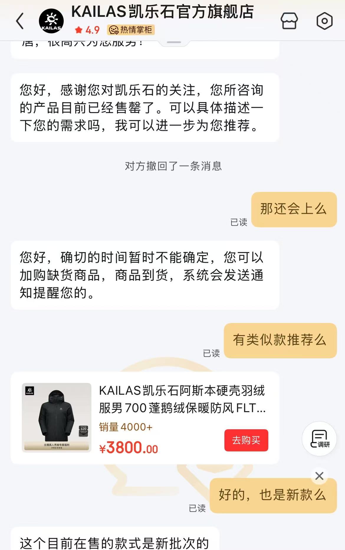引发争议的产品是,凯乐石已在网店下架的“喀纳斯”羽绒服与新推出的“阿尔塔”羽绒服。有消费者反映,两款产品从外观设计到核心面料、充绒量等关键参数均高度相似,产品信息显示大身鹅绒都是绒子含量90%,面料均是2L GORE-TEX ePE,喀纳斯售价3900元,阿尔塔售价4800元。网上该热议话题下,有网友评论称,其11月买了喀纳斯,尺码大了换没货,直播间说12月要涨价,然后12月基本无喀纳斯,换名4800了。还有网友晒出客服对话截图,回复两款的功能是一致的,暂时没有具体区别的。