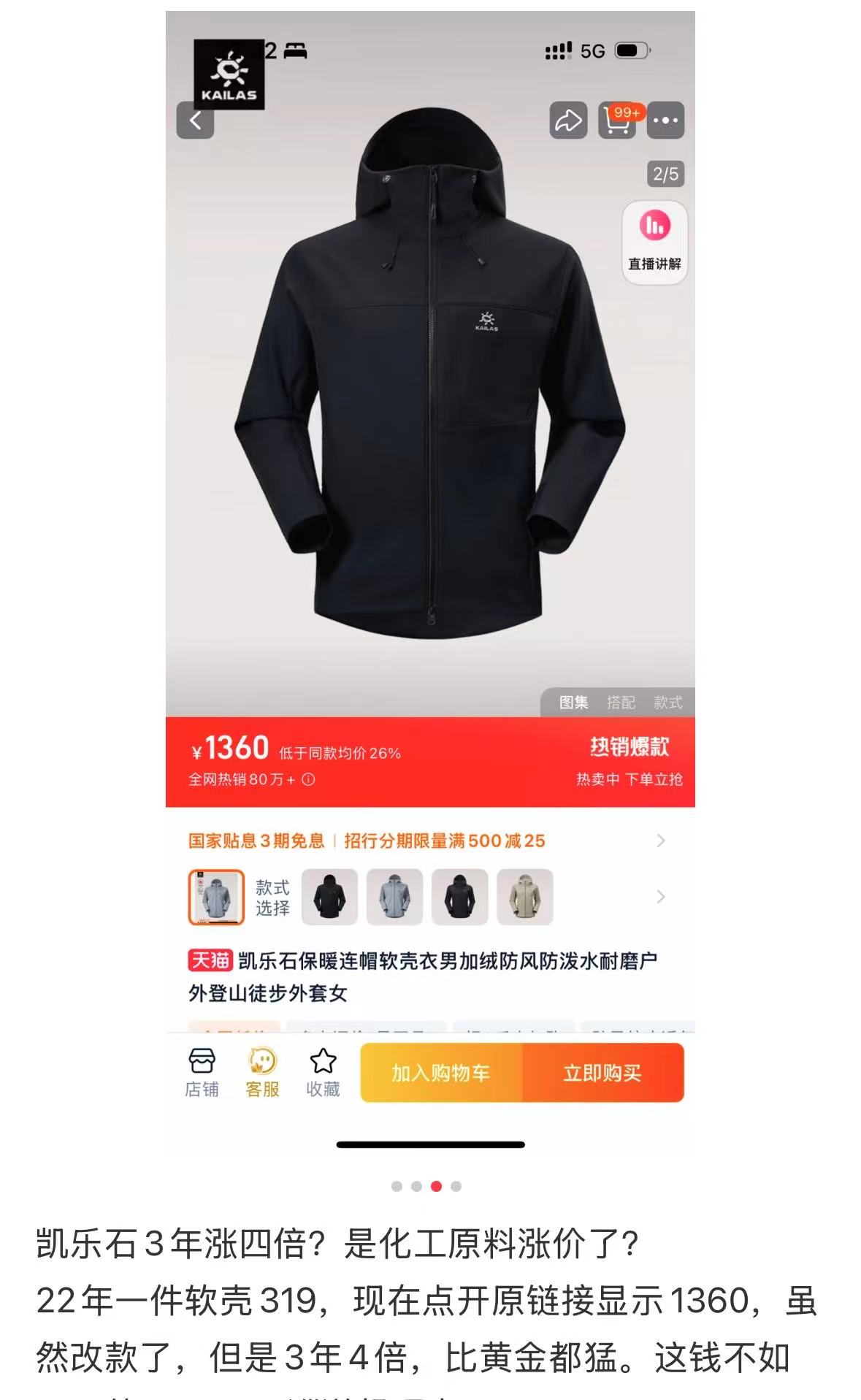 当前户外市场规模持续扩容,2025年预计突破1600亿元。近年来,凯乐石品牌发展迅速,今年双十一大促已经进入天猫户外成交榜前五名,排名高于始祖鸟、加拿大鹅等品牌。不过,也有不少消费者在网上吐槽近几年品牌涨价太快,有一位网友在网上晒出他2022年购买一件凯乐石保暖连帽软壳衣的信息,花了319元,现在点开原链接显示售价1360元,感慨“3年涨价4倍,是化工原料涨价了”?