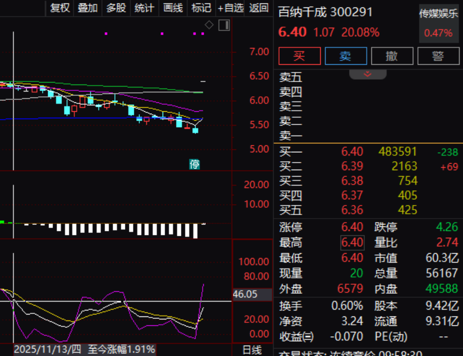 百纳千成(300291)重大资产重组预案公布,今日复牌“一字”涨停,截至9:59分,涨停板封单48.36万手。