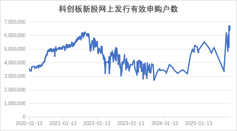 科创板新股优迅股份此前发布的网上发行数据显示,公司网上发行吸引了669.28万户投资者申购,该数据不仅刷新了年内打新人数的纪录,还是科创板开通以来的最高纪录。科创板新股强一股份的打新人数也达到668.46万户,保持在高位水平。与2024年最低位相比,科创板打新人数在近1年多时间实现了翻倍增长。