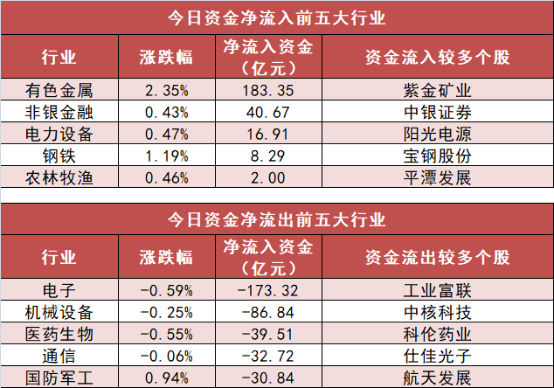 申万一级行业中,7个行业实现资金净流入,其中有色金属行业净流入183.35亿元居首。