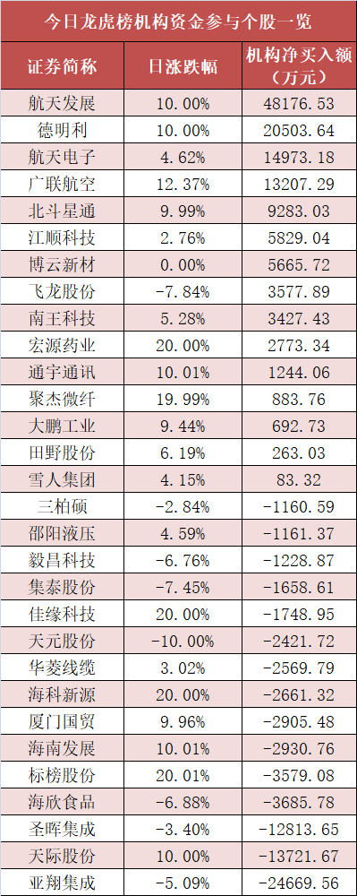 盘后龙虎榜数据显示,机构现身多股,其中航天发展等股票呈现机构资金净买入,亚翔集成等股票呈现机构资金净卖出。