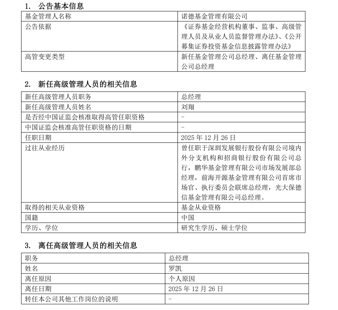 12月26日,诺德基金发布《高级管理人员变更公告》,任命刘翔为诺德基金新任总经理。罗凯因个人原因离任。